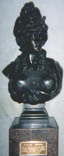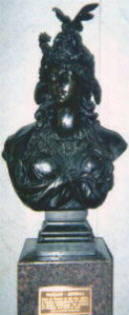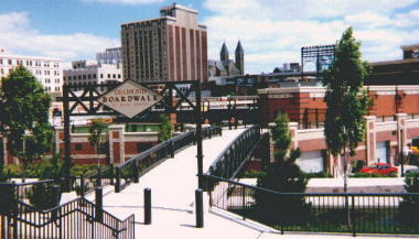 The Ohio Canal and Towpath Trail, part of the Ohio and Erie Canal National Historic Corridor, in the foreground; Canal Park, home of the Akron Aeros baseball team, in the center, and the twin spires of St. Bernard's Church, a National Historic Landmark, in the background. Left and right are busts of Pallas Athena, the Greek goddess of wisdom, displayed in the lobby of the Summit County Court House. |